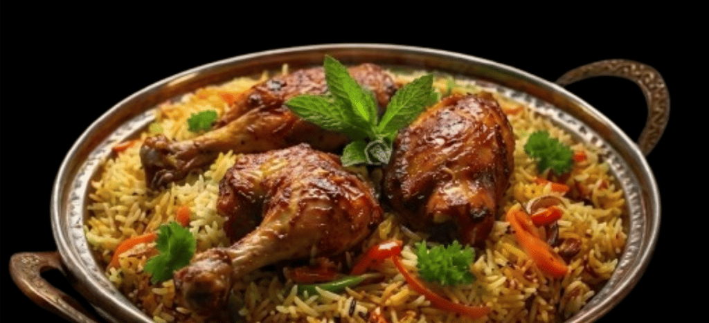 Traditional kabsa with tender chicken and fragrant rice.